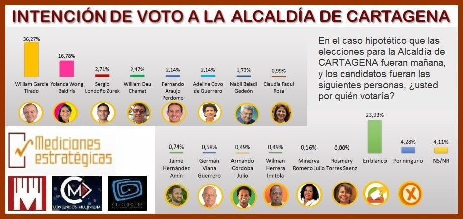 Finalmente, cabe destacar que William García tirado, continua liderando la intención de voto de los cartageneros, incluso triplicando a varios de sus contendores, razón por la cual no es de extrañar afirmaciones calumniosas como las que se han vedo haciendo con el único fin de debilitar a los electores, por ello hace un llamado para que los votantes, no se deje engañar y sigan acompañando la candidatura para 4 años de WILLIAM García Tirado, ¡Un alcalde para todos!