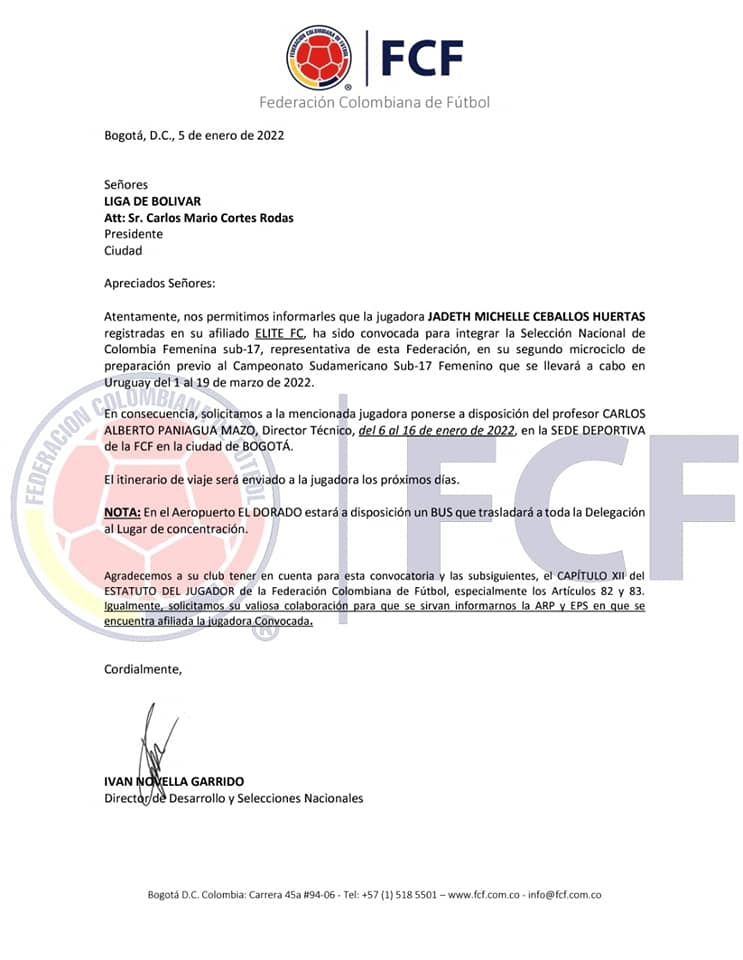 No faltaron las palabras de Jorge Luis Figueroa por la convocatoria de su pupila: “Día de fiesta para el fútbol femenino de nuestro departamento, nuestra jugadora Jhadeth Michell Ceballos fue convocada al microciclo de la Selección Colombia sub 17, que del 6 al 16 de enero y gracias al trabajo y apoyo de la Lifutbol Bolívar en cabeza de su presidente Carlos Mario Cortés al fútbol femenino de nuestro departamento. Vamos Elite FBC, vamos por más” manifestó.