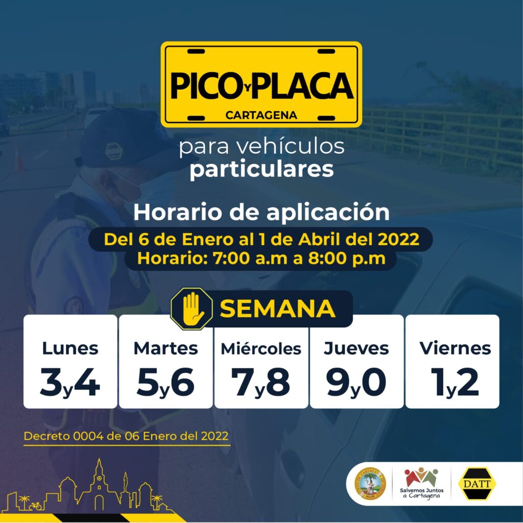 Cartagena de Indias, D. T. y C., 5 de enero de 2022.- Mediante decreto 0004 del 5 de enero de 2022, el alcalde, William Dau Chamat, adoptó medidas de restricción de circulación para vehículos particulares en el Distrito, diferentes a motocicletas y afines, mediante la implementación de la medida de pico y placa.