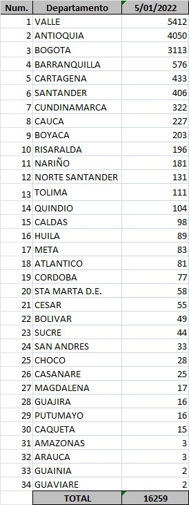 La preocupación sigue marcando muy alto en el país y en el mundo con las cifras del covid en el año nuevo , el Ministerio de Salud y Protección Social presentó, el nuevo reporte del martes 5 de enero, con 16.259 casos nuevos de covid-19 en Colombia y en las últimas 24 horas se procesaron 91.099 pruebas de las cuales 30.383 son PCR y 60.716 de antígenos.