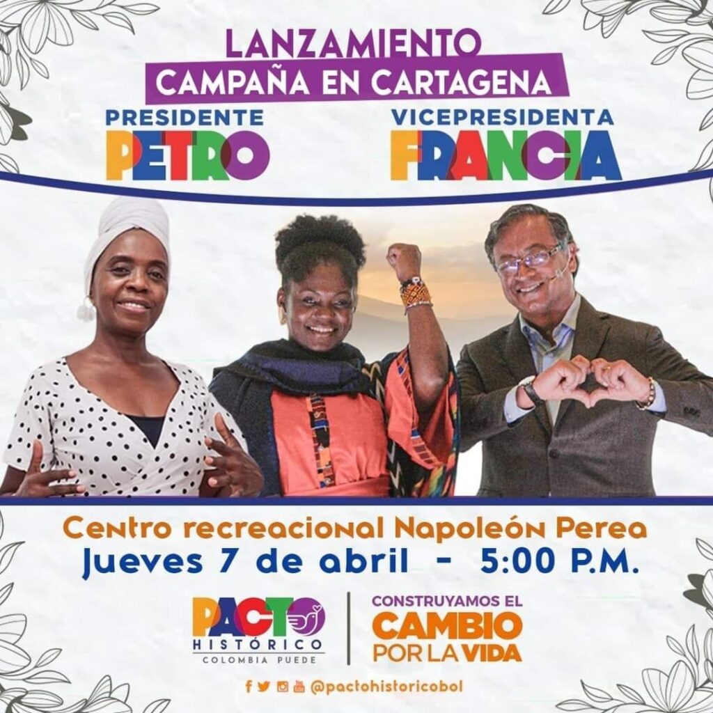 Para hoy jueves 7 de abril está programado el gran lanzamiento de la campaña en Cartagena PETRO PRESIDENTE – FRANCIA VICEPRESIDENTA, evento que tendrá lugar en el Centro Recreacional Napoleón Perea Castro, después de las 5:00 de la tarde.