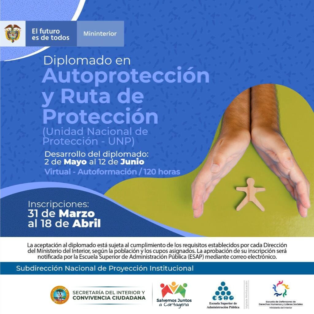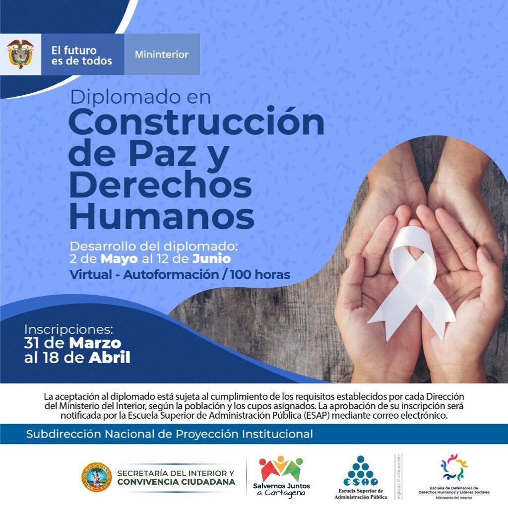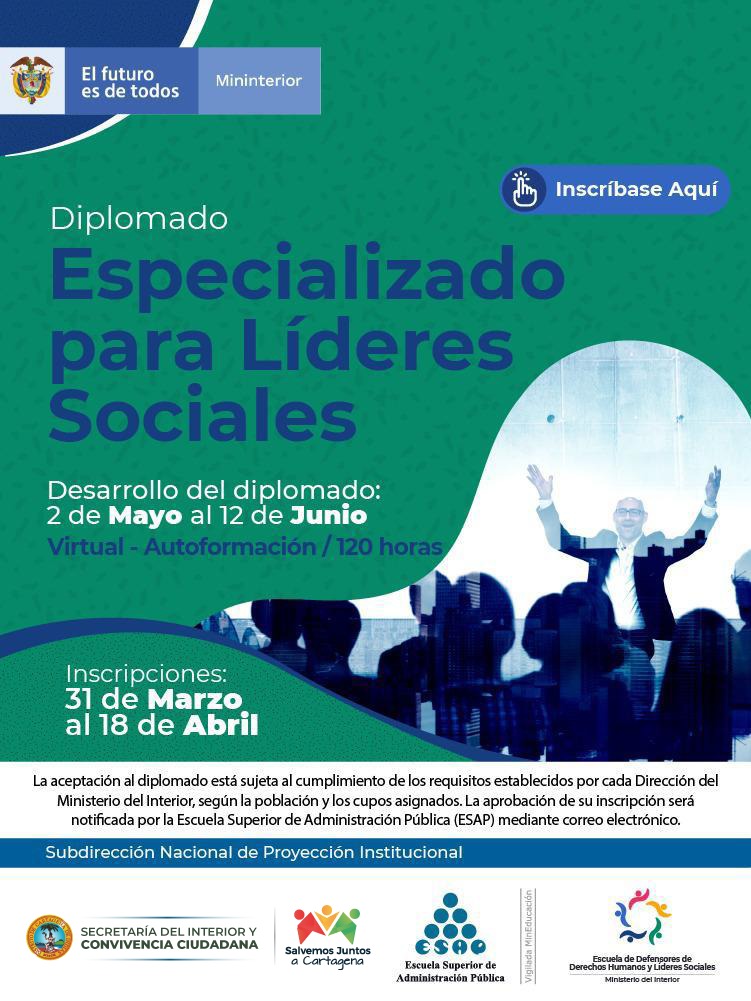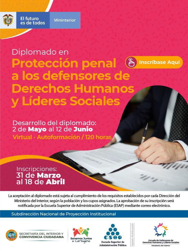 - El Ministerio del Interior y la Secretaría del Interior ofertan 25 cupos para diplomados dirigidos a líderes, lideresas y defensores de derechos humanos de Cartagena.