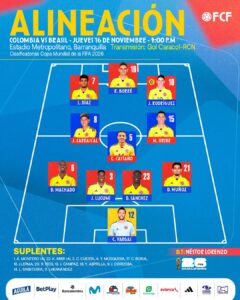 Colombia tiene nómina ofensiva recibir a Brasil.