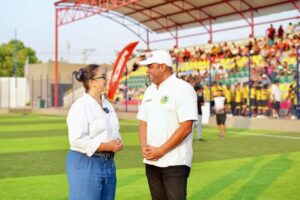 La alta funcionaria intervino en la noche de este viernes en los actos inaugurales del remodelado estadio de San Fernando, al igual que el director general del IDER, Campo Elías Theran Humanez, el presidente de la liga de fútbol de Bolívar, Carlos Mario Cortes, la Alcaldesa de la Localidad 3, Lucelly Garrido, y el futbolista profesional, Christian Marrugo.