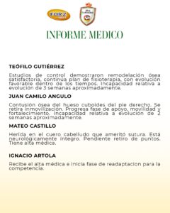 Sobre el mediocampista mixto Cristian Marrugo quien fue víctima de lesión grado 2 del músculo bíceps femoral izquierdo y Cristian Arroyave que también sufrió lesión grado 2 del músculo recto femoral derecho. señala el informe que estarán de 3 a 4 semanas aproximadamente fuera de las canchas, del extremo Jorge Mendoza indica que  tiene una distensión muscular y estará fuera 10 días.