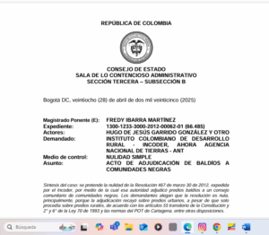Recordemos tambien que el Consejo de Estado había decidido mantener la decisión del Tribunal Administrativo de Bolívar que, en 2020, consideró que el título colectivo de la comunidad negra de La Boquilla, como nulo, al calificarlo la naturaleza del terreno como urbano y, por tanto, como adjudicable.